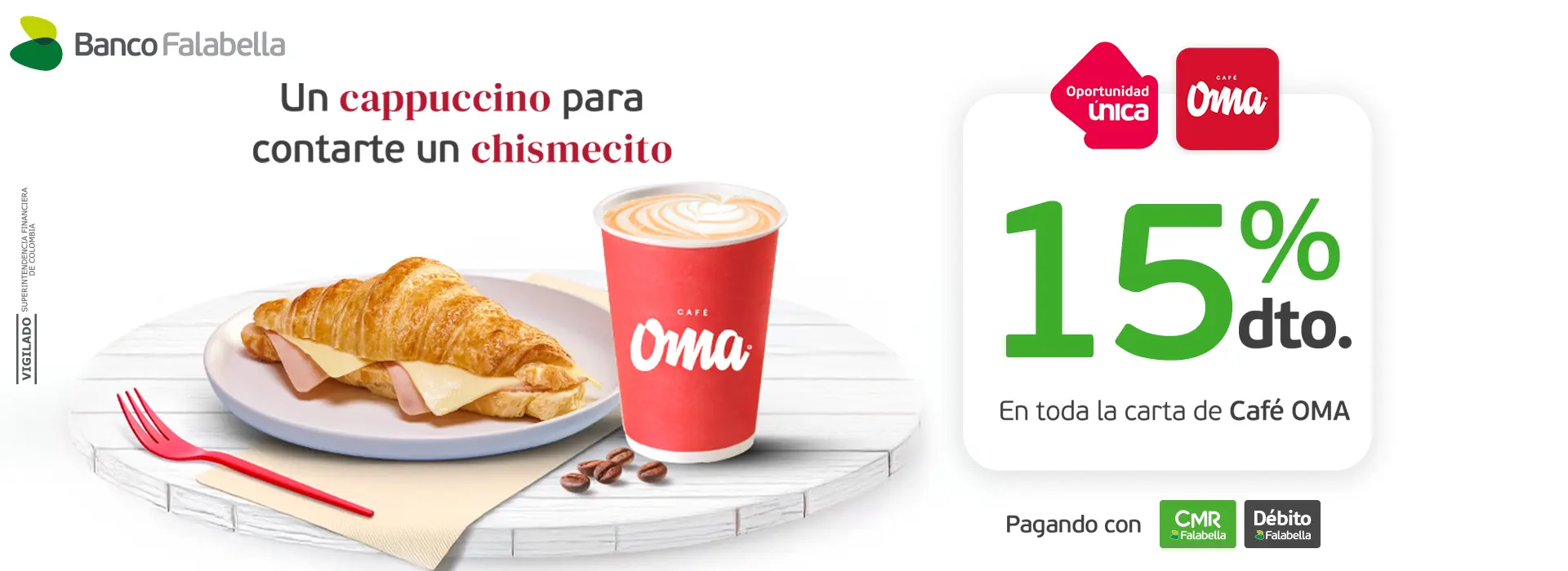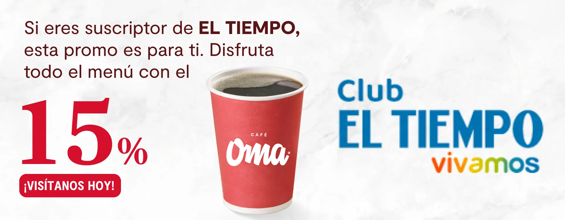 Descuento válido hasta el 31 de diciembre de 2025. Beneficio del 15% OFF en las barras de Café Oma a nivel nacional, excepto Corferias. No aplica para domicilios. Sujeto a cobertura y a los horarios de atención de cada punto de venta. Para acceder al beneficio, el colaborador deberá presentar su carné corporativo vigente al momento de realizar el pedido. El descuento no es canjeable por dinero en efectivo. Los descuentos no son acumulables con otras promociones y/o beneficios vigentes, como cuponeras o precios especiales.
