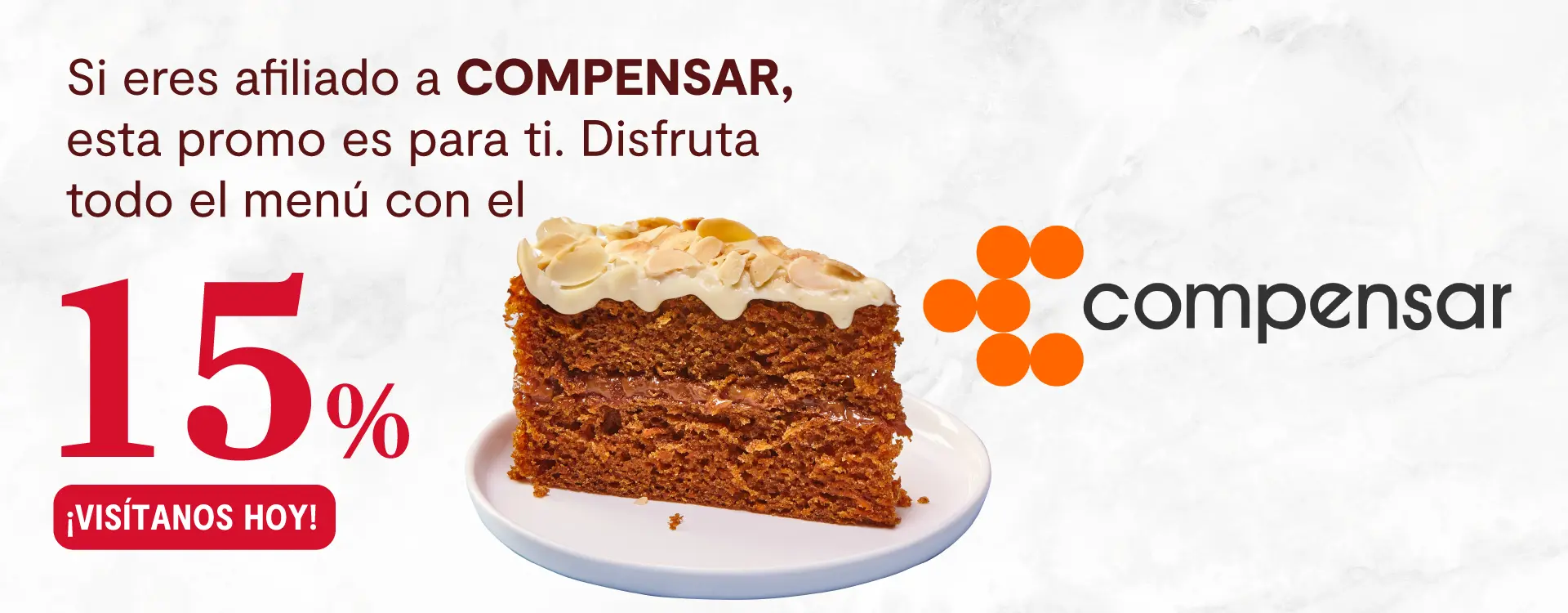 Descuento del 15% para afiliados a la Caja de Compensación Compensar en puntos de venta físico. Oferta válida todos los días del 1 de abril al 31 de diciembre de 2025 a nivel nacional. Aplica en compras de bebidas y alimentos a precio regular. Para hacer efectivo el descuento, el cliente deberá solicitarle al cajero el beneficio al momento de realizar el pedido y otorgar su número de cédula para realizar la factura y aplicar el beneficio. Si el cliente al iniciar su pedido no menciona el beneficio, el pedido será cobrado a precio regular sin descuento alguno. El descuento aplica a nivel nacional, excepto en puntos de venta de aeropuertos y Corferias.