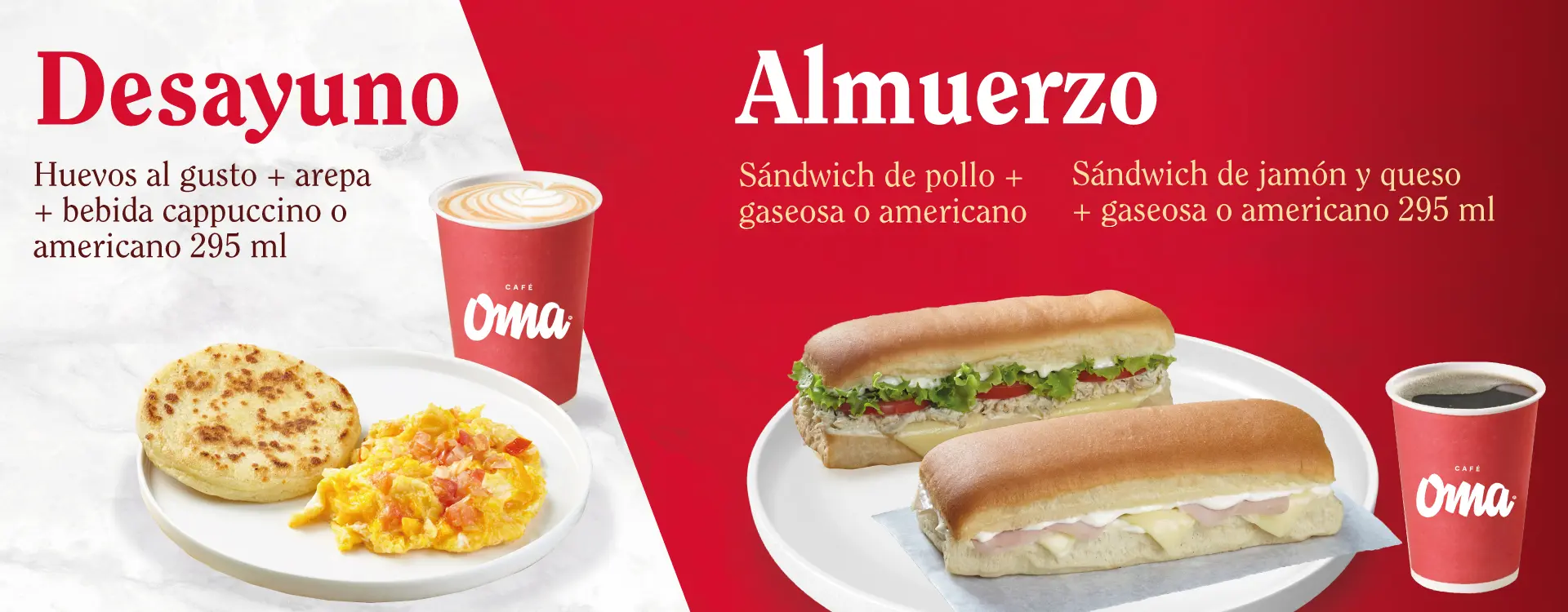 Válido exclusivamente en los puntos de venta de Café Oma ubicados en aeropuertos donde este material esté exhibido. Vigente hasta el 31 de diciembre de 2025 o hasta agotar existencias (1.000 unidades disponibles). Promoción disponible en los siguientes productos: Desayuno: huevos al gusto + arepa + bebida (cappuccino o americano 300 ml) por $17,100. Almuerzo: sándwich de pollo + bebida (gaseosa o americano 300 ml) por $24,200 o sándwich de jamón y queso + bebida (gaseosa o americano 300 ml) por $22,300. No acumulable con otros descuentos o promociones. Sujeto a disponibilidad y horarios de atención del punto de venta. Los precios pueden variar según la ubicación. No canjeable por dinero en efectivo. Imágenes de referencia.