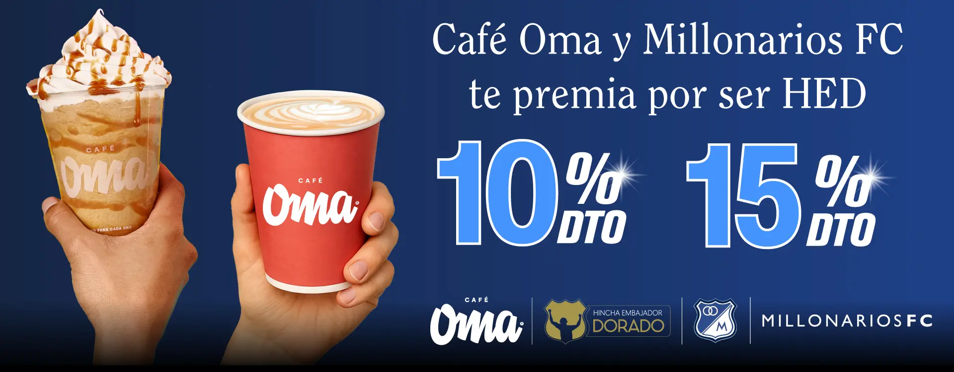 Válido únicamente para compras en tiendas físicas Café Oma. Aplica el 15% de descuento para afiliados HED y Academias MFC que presenten su carné vigente. Usuarios del Club de Beneficios (app Millonarios FC) reciben 10% de descuento al presentar su cupón digital antes de pagar. Aplica solo para productos del menú regular. No acumulable con otras promociones, descuentos, cuponeras, precios especiales ni en la compra de café empacado. Personal e intransferible. No aplica en domicilios, aeropuertos ni Corferias. Sujeto a disponibilidad. Vigente dentro del horario de atención de cada punto.