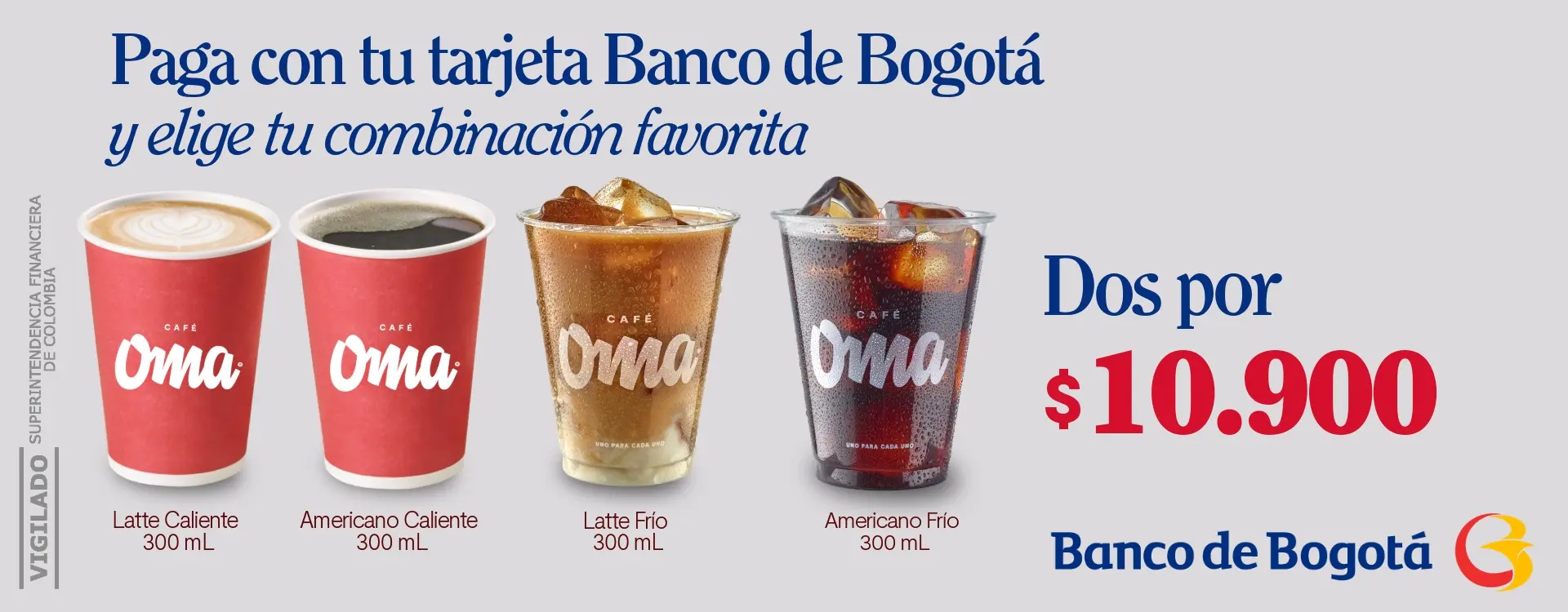 Válida del hasta el 31 de diciembre de 2025 o hasta agotar existencias (10.000 cupones disponibles). Aplica únicamente sobre el precio en puntos de venta físicos. No es válida en aeropuertos, Corferias, domicilios ni a través de agregadores. Máximo dos unidades con descuento por factura. Para acceder al beneficio, el cliente deberá solicitarlo al cajero al momento de realizar el pedido y pagar con tarjeta de crédito y/o débito MasterCard emitida por el Banco de Bogotá.