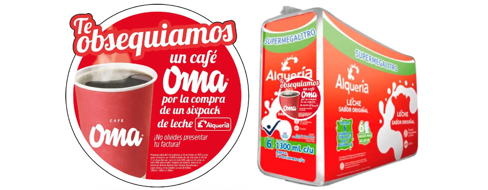 Promoción válida del 1 de septiembre hasta el 31 de octubre de 2025 o hasta agotar existencias (34 mil unidades de americano 180 ml). Por la compra de un six pack de leche Alquería (Sabor Original, Deslactosada y super cremosa, en los tamaños six pack de 900ml, 1,000ml, 1.100ml y 1.300ml), el cliente recibirá un sticker con un obsequio: americano de 180 ml gratis, el cual podrá redimir en 34 puntos de venta de Café Oma a nivel nacional. Para redimir el obsequio, el cliente deberá mostrar su factura y el sticker mencionado en el punto de venta de Café Oma. El cliente encontrará los six pack premiados en las siguientes grandes superficies: Ara (1), Cencosud (1), Jumbo (3), Olímpica (5) Carulla (6) y Éxito (17) ubicados en Bogotá, Cali, Neiva, Medellín, Barranquilla y Palmira. No acumulable con otras promociones. No aplica para domicilios. No aplica en aeropuertos ni Corferias.