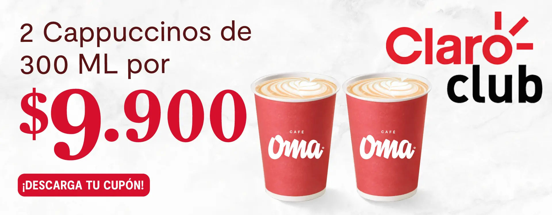 Promoción válida por la compra de 2 Cappuccino 300 ml a precio especial de $9.900. El cliente deberá mostrar su beneficio desde la app de Claro Club para acceder al descuento. Promoción válida únicamente en puntos de venta físicos, excepto en: aeropuertos, universidades, Corferias, Siemens, Policía Nacional, Fiscalía y FNA. No aplica para agregadores ni domicilios. Máximo 1 unidad con descuento por factura. Cobertura a nivel nacional. Vigencia del 1 de mayo al 30 de septiembre de 2025.