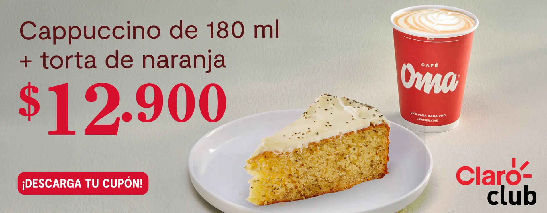 Promoción válida por la compra de 1 cappuccino de 180ml + 1 porción de torta de naranja a $12.900. El cliente deberá mostrar su beneficio desde la app de Claro Club para acceder al descuento. Promoción válida únicamente en puntos de venta físicos, excepto en: aeropuertos, universidades, Corferias, Siemens, Policía Nacional, Fiscalía y FNA. No aplica para agregadores ni domicilios. Máximo 1 unidad con descuento por factura. Cobertura a nivel nacional. Vigencia del 1 de enero al 31 de marzo de 2026.