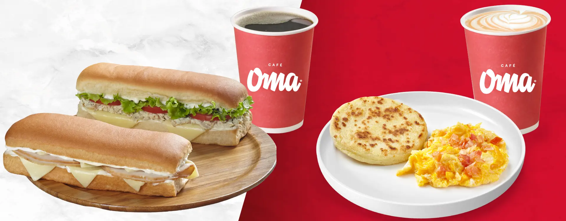 Válido exclusivamente en los puntos de venta de Café Oma ubicados en aeropuertos donde este material esté exhibido. Vigente hasta el 30 de junio de 2026 o hasta agotar existencias (1.000 unidades disponibles). Promoción disponible en los siguientes productos: Desayuno: huevos al gusto + arepa + bebida (cappuccino o americano 300 ml) por $17,300. Almuerzo: sándwich de pollo y queso o pavo + bebida (gaseosa o americano 300 ml) por $25,700. No acumulable con otros descuentos o promociones. Sujeto a disponibilidad y horarios de atención del punto de venta. Los precios pueden variar según la ubicación. No canjeable por dinero en efectivo. Imágenes de referencia.