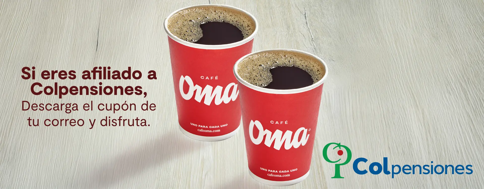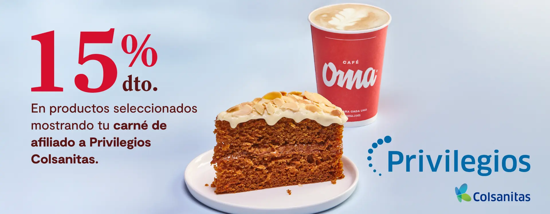 Descuento válido hasta el 28 de febrero de 2026. Beneficio del 15% OFF en las barras de Café Oma a nivel nacional, excepto Corferias. No aplica para domicilios. Sujeto a cobertura y a los horarios de atención de cada punto de venta. Para acceder al beneficio, el colaborador deberá presentar su carné corporativo vigente al momento de realizar el pedido. El descuento no es canjeable por dinero en efectivo. Los descuentos no son acumulables con otras promociones y/o beneficios vigentes, como cuponeras o precios especiales.